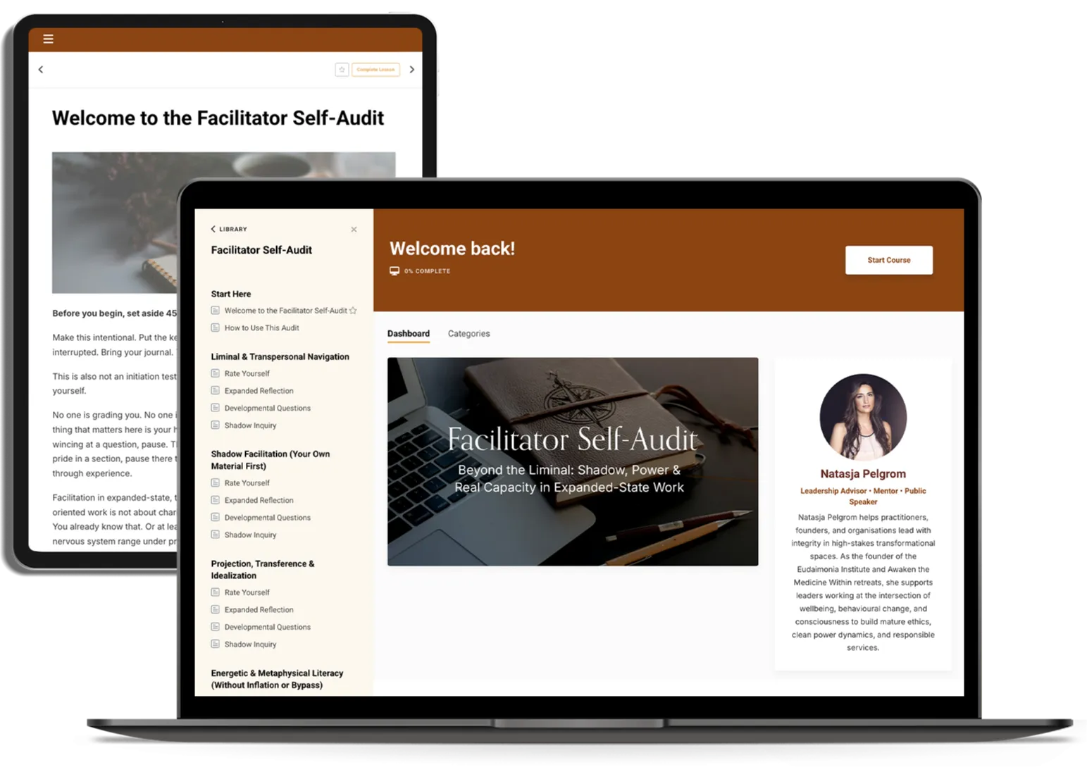 Explore your strengths, blind spots, shadow edges, and developmental growth areas across facilitation, power, ethics, psychological literacy, group dynamics, business structure, and self-stewardship.